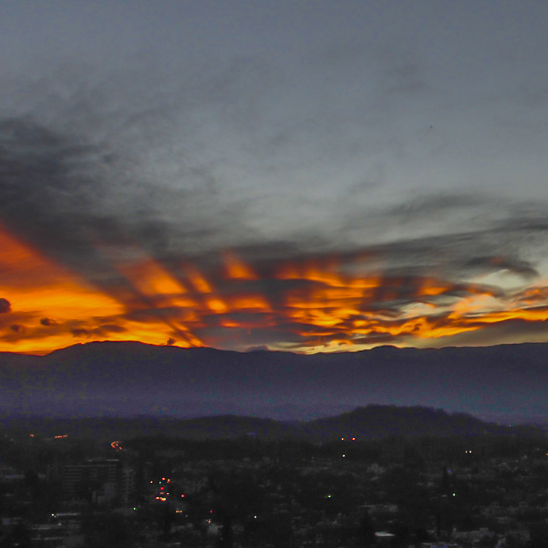 Muchos de los atardeceres más lindos se producen cuando hay viento Zonda en altura y los últimos rayos del sol tremendamente dispersados (de ahí su color anaranjado) dan contra las altísimas nubes. El dato más interesante de la foto es la proyección de las sombras de los seismiles de la cordillera Principal (Aconcagua, Plomo) contra las nubes, proporcionando al observador una visión indirecta de ellos.