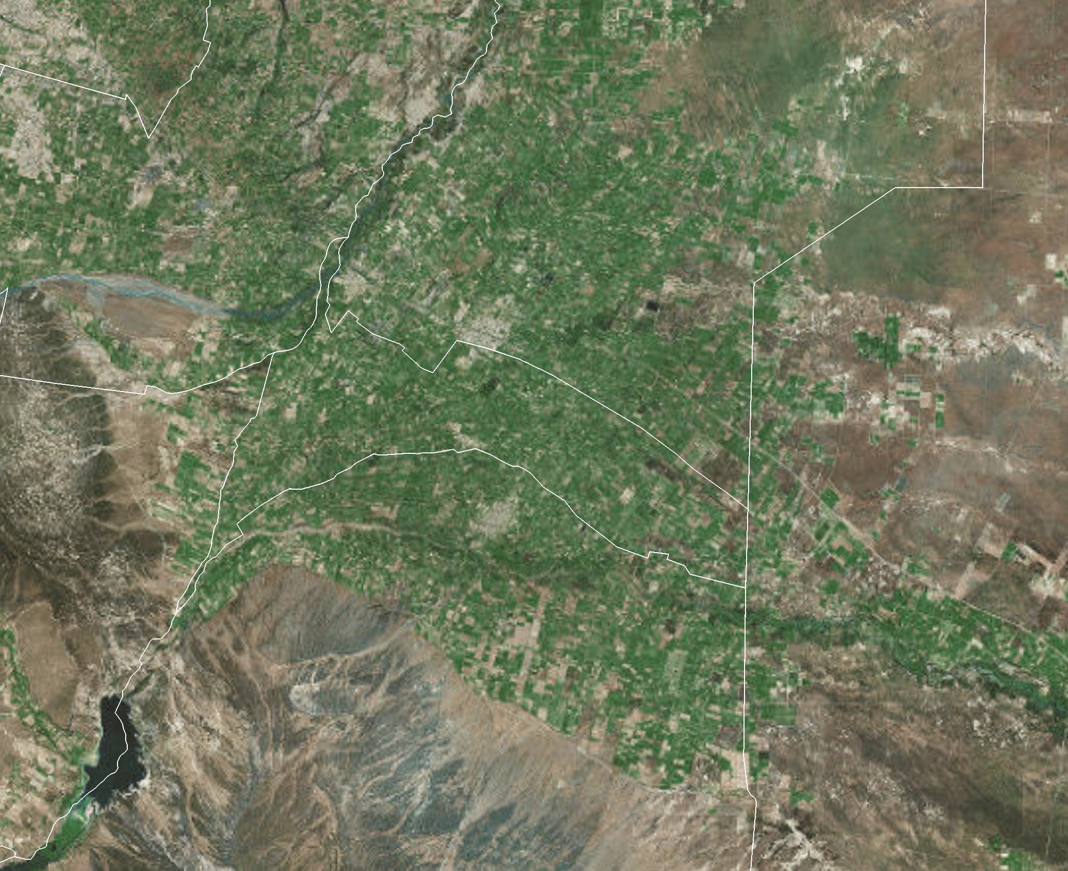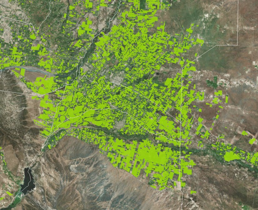 En la primer imagen satelital se aprecian la división departamental, junto con las principales localidades y ríos. La segunda foto es lo mismo pero se le adicionó la superficie de viñedos para que el lector tenga idea de la magnitud que representa esa región vitivinícola. Por último, se muestra un mapa de orientaciones junto con la referencia. En él se aprecian bien delineadas las sierras del sur de Rivadavia, la bajada pedemontana de la sierra de Lunlunta-Carrizal, la región de médanos de la planicie fluvial y el abanico del río Mendoza. La línea blanca separa a la planicie de otras regiones como las cerrilladas y la depresión pedemonta. Las líneas negras son curvas de nivel cada 10 metros y se puede ver como van avanzando desde la zona de Medrano (ápice) hacia el NE. En la zona del oeste las curvas están mucho más apretadas, indicando una mayor pendiente. Otro detalle que se ve en los mapas son los antiguos cauces del Tunuyán. El Cañada de Moyano es sólo uno de ellos pero el más notorio.