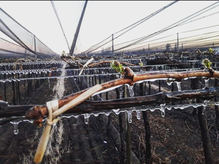 En la madrugada de hoy se realizó la primera defensa de heladas en los diferentes oasis de Mendoza. En un par de días se conocerá con mejor detalle el alcance de los daños ocasionados. En la foto se aprecia un viñedo de Vista Flores al amanecer. Allí el termómetro descendió hasta -1.5°C a las 4.00AM y se mantuvo así hasta el amanecer. Fue tomada por el amigo