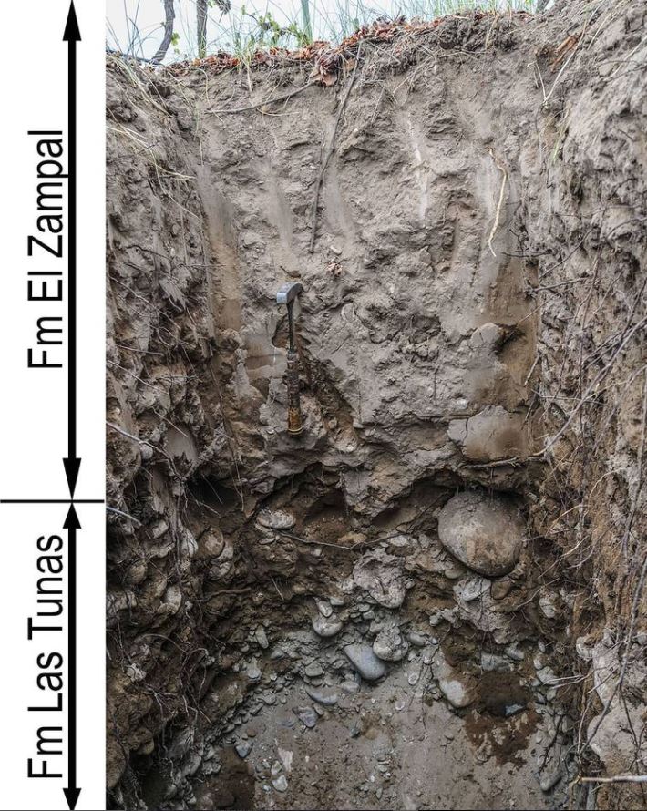 Se presenta una primera capa de textura arenosa (90% arena) a areno francosa de origen fluvio-eólica correspondiente a la Fm El Zampal. Es espesor varía de cero a 2 metros excepcionalmente. Puede encontrarse suelta, masiva, sin estructuras sedimentarias (origen eólico) o con algún retrabajamiento del tipo fluvial ocasionado por las tormentas de verano (en general mud flows). Esta capa cubre los conglomerados fluviales de la Fm Las Tunas (Pleistoceno). En el contacto entre ambas formaciones es usual encontrarse con desarrollo de carbonatos de potencia variable, dependiendo de el espesor de la capa superiora. El estudio del comportamiento y heterogeneidad lateral, así como la delimitación de sectores de iguales características es parte de la agricultura de precisión que se está llevando a cabo en los viñedos de la zona.