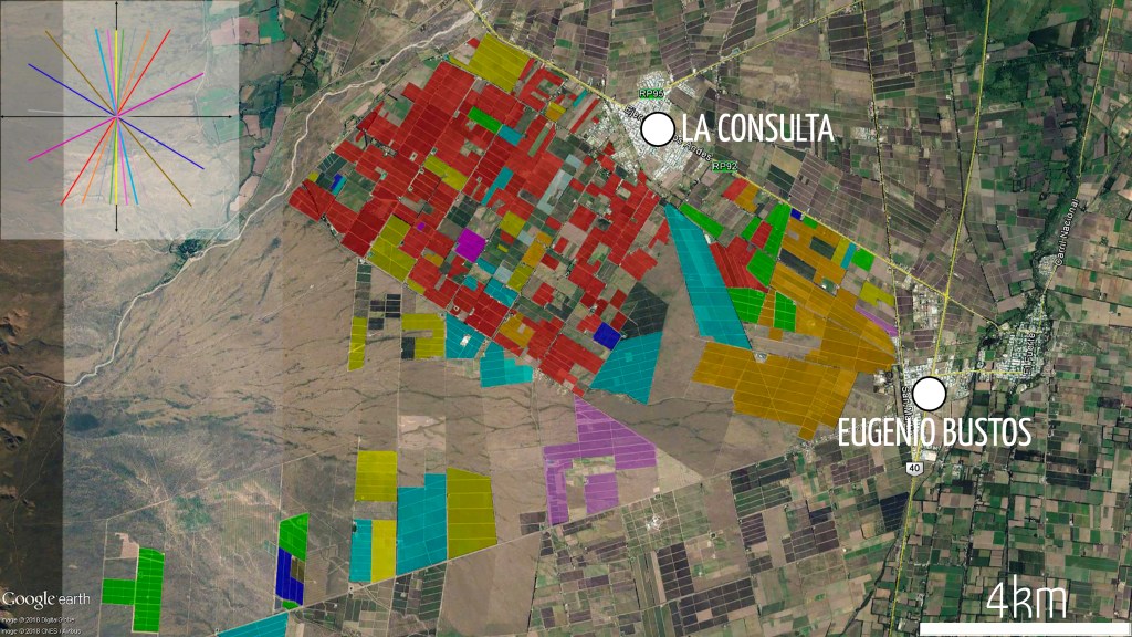 Este distrito posee ciertas curiosidades que lo hacen único. Una de ellas es el amplísimo rango de orientaciones de los espalderos. Quien les escribe llegó a detectar 14 orientaciones diferentes. La que más abunda es la marcada con color rojo (NE-SW), orientada con respecto a las calles. La segunda en abundancia es la amarilla (N-S). Cabe aclarar que no hice el análisis de todo el distrito sino de una porción representativa. Para los puristas, alguno de los viñedos analizados están en el distrito de Eugenio Bustos.