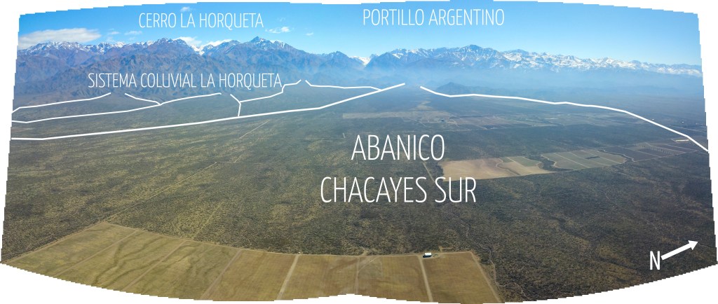 En este caso, el distrito de Los Chacayes lo constituyen el abanico doble de Chacayes y el sistema coluvial de La Horqueta, el cual fue restringido en su desarrollo sur por el siguiente gran abanico de la zona, el de La Remonta. Si bien es todo Los Chacayes, los perfiles de fincas ubicadas en diferentes sectores del distrito muestran perfiles totalmente diferentes entre sí. En la fotografía puede verse parte de lo explicado, con una vista hacia el oeste desde 500m de altura sobre el terreno. La ruta que sube al Manzano se aprecia sobre la esquina superior derecha.