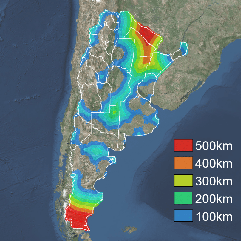 Sucede que en general existe un gran desconocimiento respecto a los proyectos vitivinícolas que se desarrollan a lo largo y ancho del país. A pesar de estar condensada el 75% de la superficie de viñedos en Mendoza, existen proyectos en otras 16 provincias! Las provincias no productoras son apenas 6 (Tierra del Fuego, Santa Cruz, Santa Fe, Corrientes, Chaco y Formosa). Este mapa muestra en líneas la equidistancia a los viñedos para el sector continental. Es interesante notar que el 75% de la superficie del país se encuentra a 200km o menos de distancia en línea recta. O dicho de otra forma, estamos más cerca de lo que creemos de losblugares donde nace nuestro querido vino argentino.