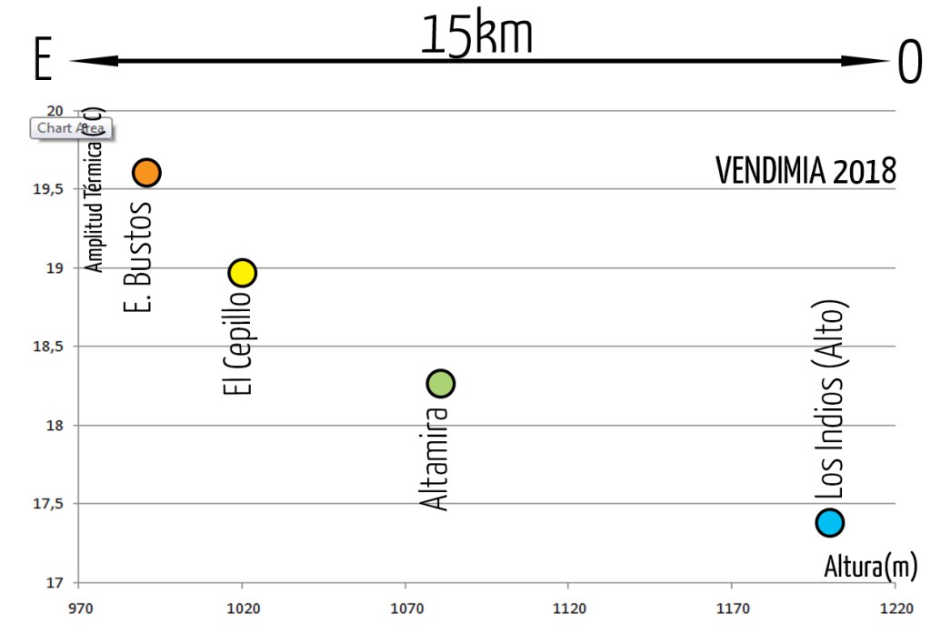Contrario a la arraigada creencia, son muchísimos los lugares donde más altura significa MENOS amplitud térmica, esto va en contra de una de las frases más repetidas, pero sin datos duros que lo sustenten. Esto mismo se repite en los sectores de Tunuyán, Tupungato, Primera Zona, San Rafael, Cafayate, Calingasta o otros lugares. El por qué hay más amplitud térmica a menor altura es un poco largo, pero se puede resumir en el comportamiento o distribución de las temperaturas mínimas. En los valles, el aire frío y más denso se desplaza hacia las partes bajas. Para tener una idea, en la vendimia pasada se registró la misma temperatura mínima promedio (SEP-ABR) en la ciudad de Tunuyán que en la parte más alta cultivada de Tupungato, a 1600msnm!