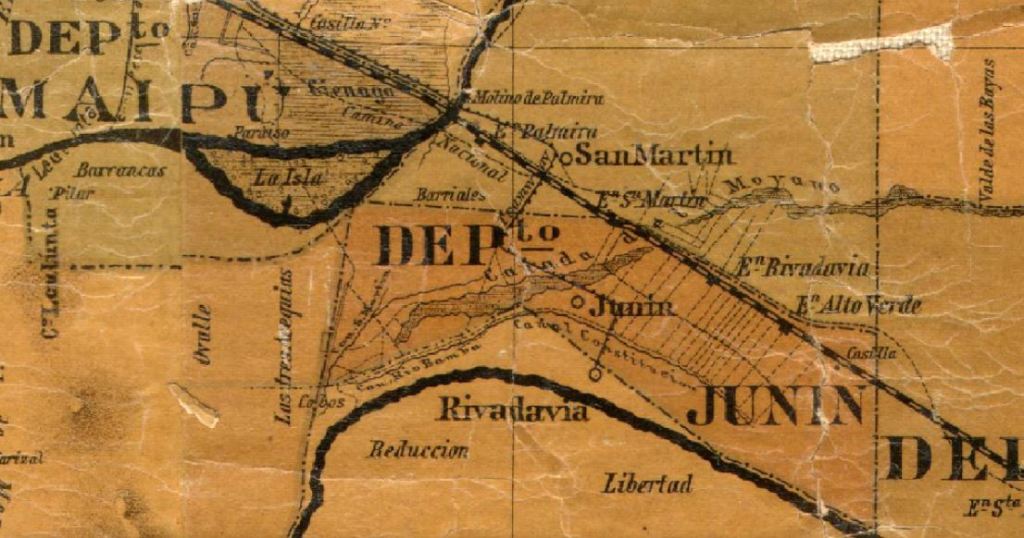 La Isla y Cañada de Moyano. Ayer mostrábamos estos rasgos pertenecientes a los ríos Mendoza y Tunuyán cuando fluían libremente. Hoy volvemos sobre ellos para mostrarlos cómo estaban señalados en un antiguo mapa de la provincia de Mendoza de 1892. En los próximos días comentaremos el por qué de la formación de La Isla, el por qué se produjo ese ensanchamiento del Mendoza y que tiene que ver con ello la «estructura Cruz de Piedra», un alto que pasa desapercibido al ojo no entrenado. El mapa fue obtenido de la librería de mapas digitalizados Rumsey.
