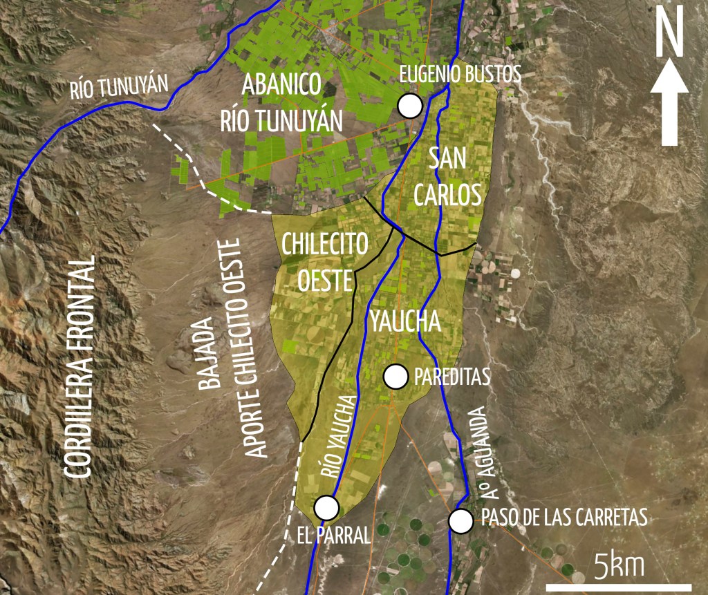 «Una característica diferencial de este sector es que la planicie Yaucha se desarrolló de sur a norte, en sentido perpendicular al crecimiento de la bajada sur, que fue de oeste a este. Esto generó una competencia entre la depositación de la bajada y la erosión del arroyo, por lo que se generaron terrazas en el borde oriental de la zona de coalescencia. La planicie Yaucha posee suelos que gradan desde arenosos, areno-francosos, hasta franco-limo-arenosos. Por otro lado, al desarrollarse el escalón de la falla de El Chalet, se reconfiguró la red de drenaje de la bajada sur, que se orientó hacia el noreste desde su sector de coalescencia y generó la planicie de Chilecito oeste, de textura arenosa.»