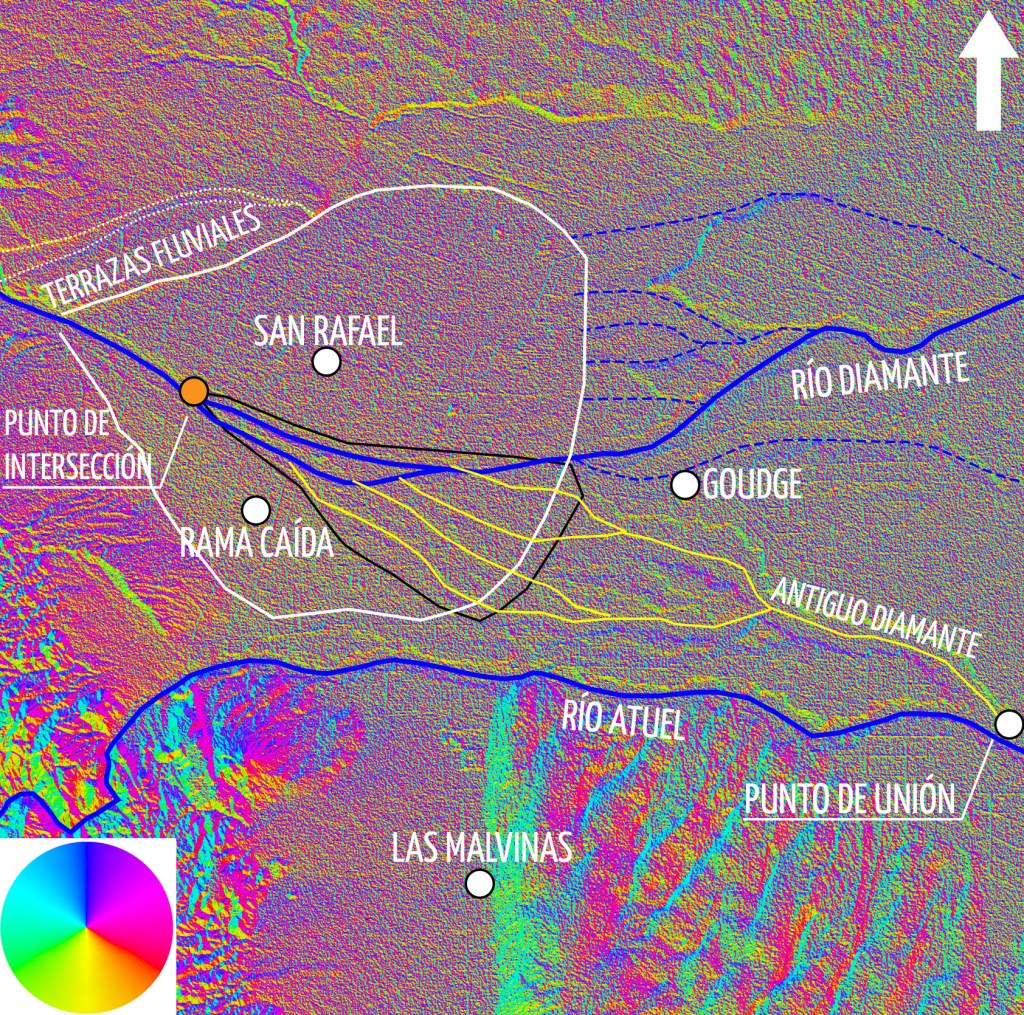 Hace una semana hablamos de terrazas aluviales del río Diamante y hoy nos volvemos a poner técnicos para profundizar en el estudio de la geología sanrafaelina. El oasis sur es regado por los ríos Diamante y Atuel, pero por causas que no viene al caso, sólo el DIAMANTE construyó un abanico aluvial sobre la planicie (línea gruesa blanca). Esto se puede ver en la forma de las curvas de nivel (en blanco) y en los múltiples antiguos cauces que aparecen en su sector distal (en trazas azules). El ATUEL fue relegado y pasa por el borde sur del valle. Ahora bien, antes de la intervención humana, el Diamante se unía con el Atuel en una zona de Negro Quemado. Esta unión se producía pq el Diamante tiene su punto de intersección aguas arriba de la isla homónima y su lóbulo de depositación actual (en naranja) lo conformaban el triángulo Rama Caída-Salto Las Rosas-Goudge (aprox). Desde el borde este de la isla salían diferentes cauces (en amarillo) con dirección al río Atuel, conformando un potente único río que finalizaba en los bañados del Atuel (La Pampa). En 1809, Don Miguel Telles Meneses desvió el Diamante hacia un antiguo cauce que termina en el río Salado/Desaguadero. El objetivo de su misión era proveer de agua a los inmigrantes que encaraban «la travesía», un trayecto que iba desde el Salado hasta 25 de Mayo y el cual sin agua se tornaba inviable para personas y animales.
