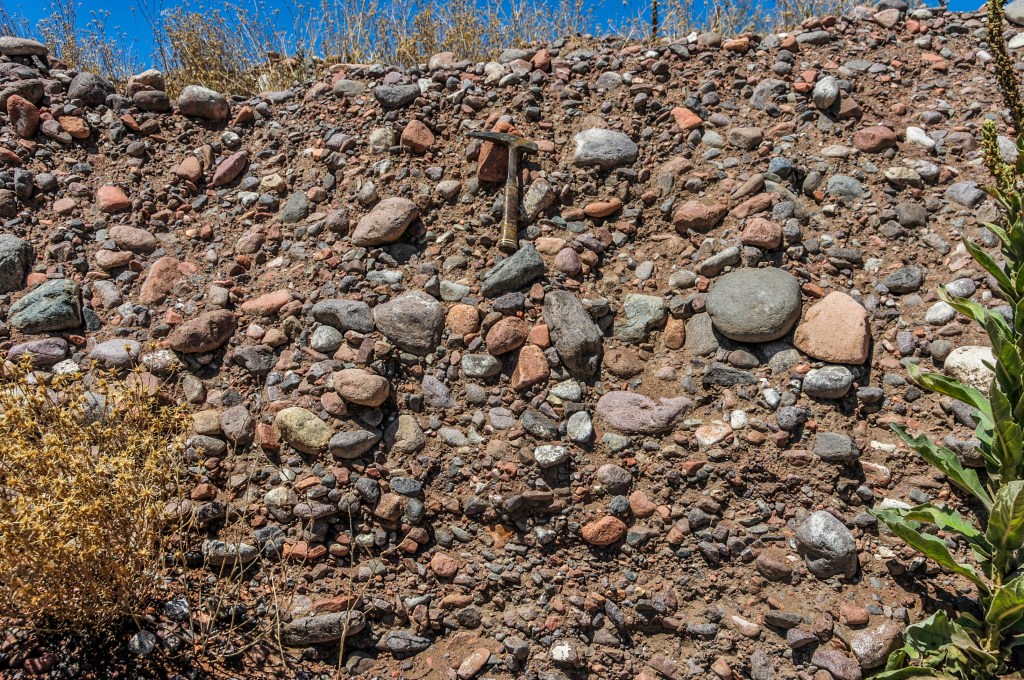 En las cercanías al Clos de los 7, (distrito de Campo Los Andes, Tunuyán), se encuentra un afloramiento que representa un muy buen ejemplo de lo que significa un depósito aluvial «puro». Un montón de clastos («piedras») de dimensiones que llegan a los 50cm(*) dispuestos de forma desordenada y «flotando» en una matriz de arena gruesa a muy gruesa. El ordenamiento es casi nulo, no existe contactos entre clastos (salvo en un nivel medio), son subredondeados y presentan baja esfericidad (clasificación de Pettijhon de 1973). Estos depósitos son del tipo flujo de detritos («debris flows») y son parte del gran abanico que baja desde La Remonta, y que vimos algo de él en la publicación anterior. De momento lo dejamos acá, pero volveremos sobre esta zona. (*) Como escala, la piqueta mide 30cm.
