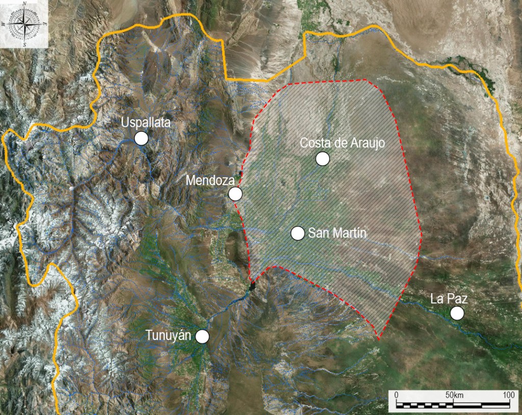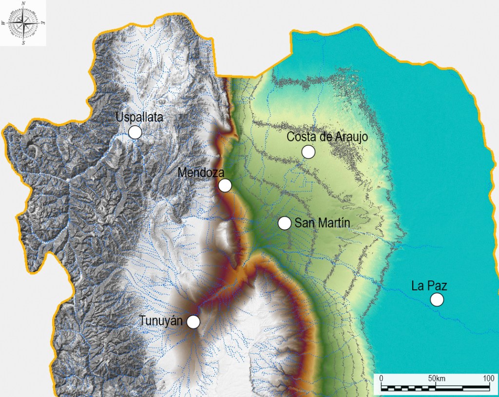 Volvemos una vez más al corazón productivo de la vitivinicultura argentina. En anteriores publicaciones (revisar en perfil) mostramos el sector de la desembocadura del Tunuyán en el llano y como la migración lateral del mismo dejó cicatrices (paleocauces) visibles aún hoy. Ahora queremos mostrar de forma más general el gran abanico desarrollado por los ríos Mendoza y Tunuyán cuando se unían en la desembocadura al llano. En el holoceno, los ríos se encontraron con un gran campo de dunas desarrollado en la llanura oriental el cual “peinaron”, esto es, erosionaron parcialmente y lo cual también se sumaron los sedimentos más finos transportados por ambos cursos de agua.