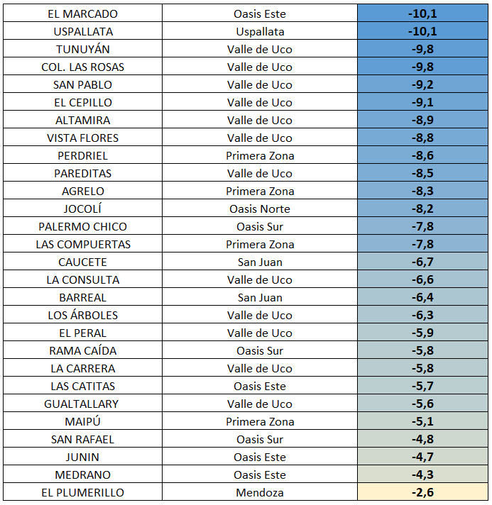 En el día de la fecha los termómetros de los oasis del centro oeste argentino registraron las mínimas más bajas en lo que va del año, superando en casi todos los casos los registros de las gélidas mañanas del 5 y 25 de julio. Los datos mostrados fueron obtenidos de diversas estaciones a lo largo de los lugares más representativos a nivel vitivinícola. Uspallata, enclavada en el medio de la cordillera y El Marcado, ubicada en el desierto santarrosino (este del oasis este), fueron las dos locaciones donde el termómetro llegó a los dos dígitos bajo cero.