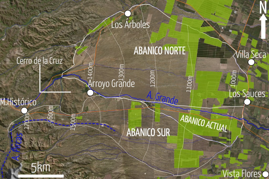 El límite inferior lo marca aproximadamente la cota de los 1000m (RP90), con un cambio abrupto en la pendiente, que pasa del 3,5% al 1%, la aparición de arroyos (indicativo que estamos en los pies del abanico) y la profundización del manto franco arenoso superior, por encima de los 2m de espesor. En la imagen satelital aparecen las curvas de nivel, los viñedos y los límites de los abanicos, entre otras cosas más.