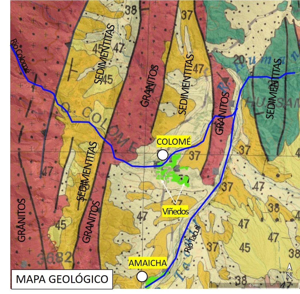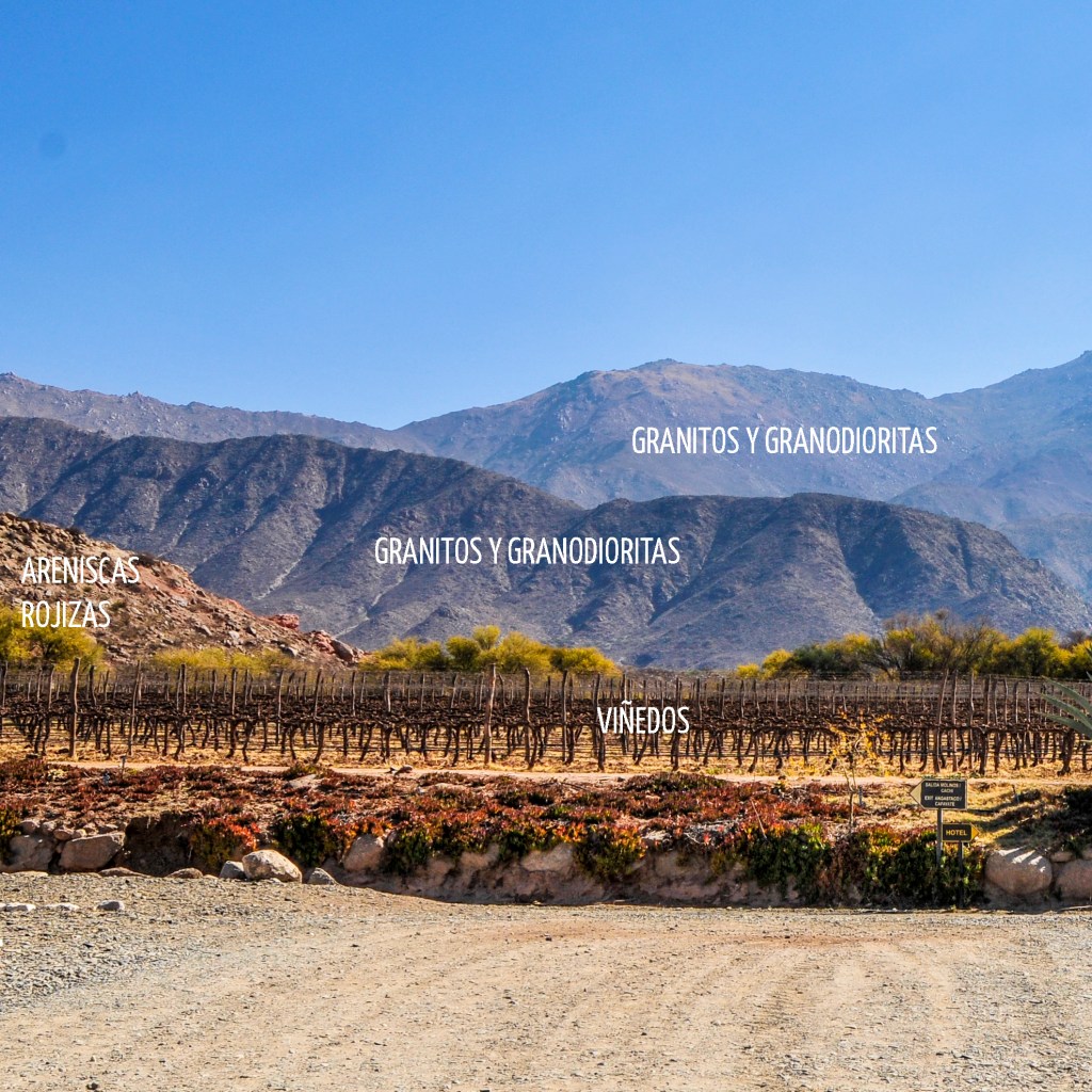 A veces tendemos a sobre simplificar la variada, rica y compleja geografía de los sectores productivos del NOA. Si uno se toma el trabajo de estudiar detenidamente la ubicación de los viñedos, lo primero que se viene a la mente es «esto es un quilombo». Pero a no asustarse, ¡es un quilombo lindo, entretenido, y que le aporta la unicidad del sentido de lugar! Es el caso de Colomé. La estancia y sus viñedos están sobre un valle tectónico que literalmente, está fallando y elevando todo a su alrededor. Las montañas que lo rodean son granitos de edad muy antigua y en diversos sectores aparece una roca rojiza que son conglomerados, areniscas, limolitas y arcilitas de edad más reciente (subgrupo Pirgua, Cretácico Medio).
