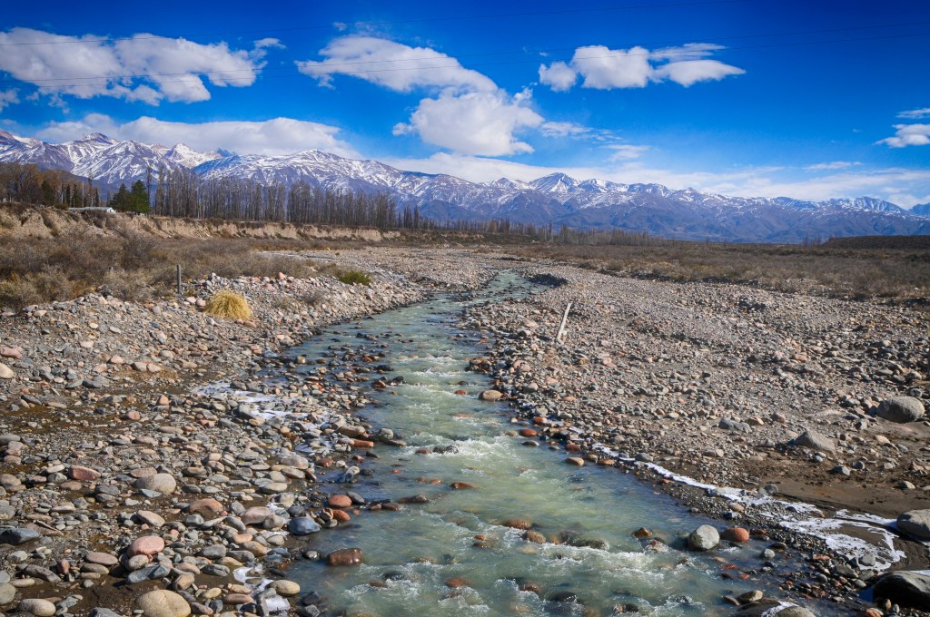 Fotografía desde el puente alto hacia el oeste, en una hermosa mañana de invierno. Es la segunda fuente de agua más importante del Valle de Uco, después del río Tunuyán, y la más importante de la porción norte. Abastece con agua superficial a los sectores más altos cultivados de todo el valle y subuperficialmente recarga las napas desde donde cientos de pozos toman el vital líquido. También sirvió de límite geográfico en el sector cultivado entre los departamentos de Tupungato y Tunuyán.