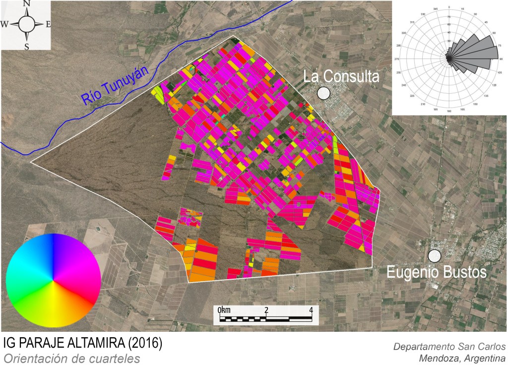 Mapa de las orientaciones de cada uno de los 625 cuarteles plantados a la fecha en la Indicación Geográfica @paraje_altamira. Se aprecia como las pendientes varían de ENE hasta ESE, dependiendo de la posición del abanico que se esté. El diagrama de rosas superior muestra justamente la distribución de ellas.