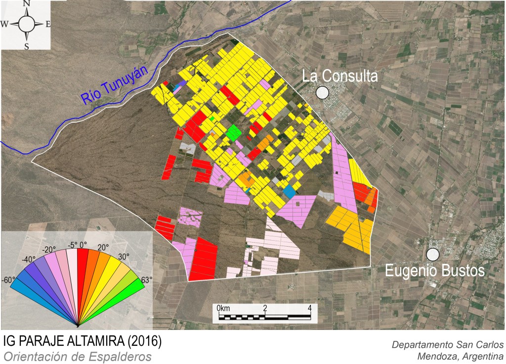 Orientación de espalderos. Festejamos la obtención del máximo puntaje para un vino proveniente de esa IG (indicación geográfica) con un mapa donde se muestra la variabilidad en la orientación de los espalderos.