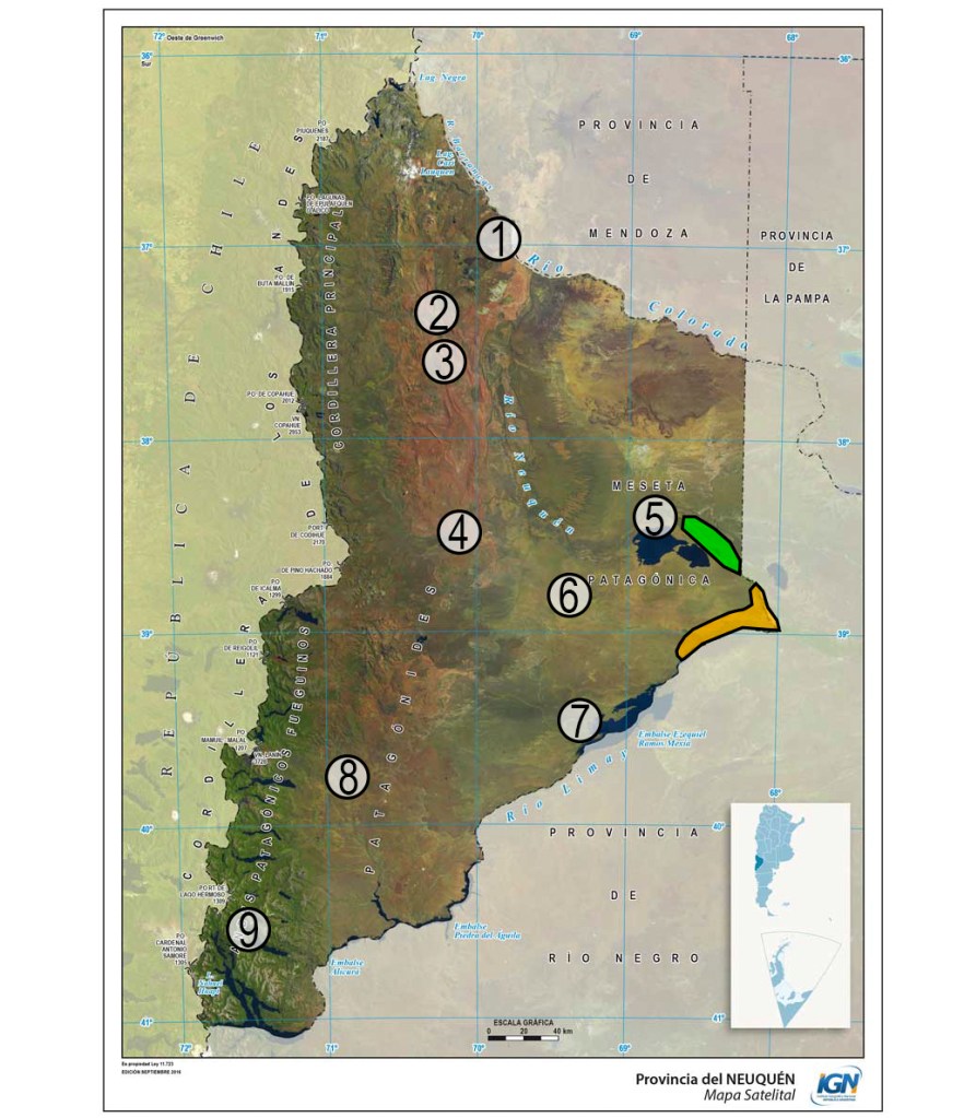 NEUQUÉN es una provincia extensa y de grandes contrastes, que tiene concentrada la inmensa mayoría de sus 1580ha de viñedos en la zona de San Patricio del Chañar (verde) y algo más en el eje Plottier-Senillosa (naranja). A diferencia de otras provincias, aquí la mayor dificultad no es la falta de agua, sino el viento (sector central y este) y el frío (sector cordillerano). En años recientes la vitivinicultura explotó en muchos otros lugares de la provincia sureña, y eso es lo que vamos a mostrar. Existen 2 viñeditos sobre las laderas del volcán Tromen, en Buta Ranquil (1). Chos Malal tiene una larga historia relacionada al vino que merece ser contada aparte (2) y no muy lejos de allí hay un muy lindo proyecto en Taquimilán (3). En Bajada del Agrio hay desde hace tiempo dos viñeditos alejados completamente de todo (4). Sobre la meseta y muy cerca del lago Mari Menuco está el famoso y nuevo «viñedo de Vaca Muerta» (5). En la muy desértica y ventosa Plaza Huincul – Cutral Co hay dos nóveles proyectos (6). En el valle inferior del río Picún Leufú tiene su historia, y hay diversos viñedos chicos (7). A 50km al este de San Martín de los Andes, en la estancia Chumehuin hay un viñedito experimental (8) y en la zona de los siete lagos existen una 4ha de otro viñedo también experimental (9). ¿Se nos pueden haber escapado algún viñedo en otro lugar fuera de los mencionados? Posiblemente, si lo conocen déjennos un comentario. En esta publicación mostramos la diversidad de lugares de la vitivinicultura neuquina y las diferentes posibilidades que brinda, desde la cordillera en el límite con Chile hasta el nacimiento del río Negro y del Alto Valle. Será hasta la próxima!