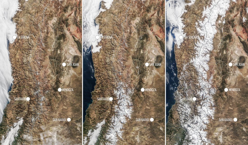 En la foto, se aprecia a la izquierda la montaña antes de la primer nevada de la temporada, luego de la primera gran nevada que alcanzó a cubrir hasta la latitud de Mendoza (centro) y por último, una segunda nevada que llegó hasta la Puna catamarqueña incluída (derecha).