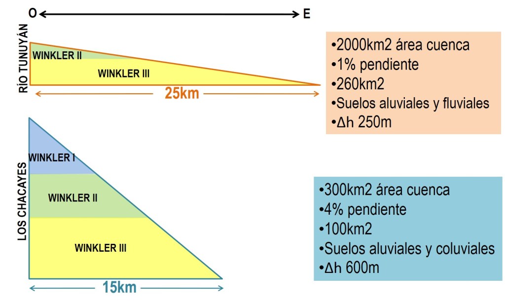 Vamos a dos ejemplos claros dentro del Valle de Uco. El abanico del río Tunuyán, cuya cuenca es la mayor de los ríos del valle, tiene la menor pendiente. Esto hace que en zonas tan distintas como La Consulta y la parte más alta de Altamira haya apenas 180 metros de desnivel. O que entre la parte más alta y más baja de El Cepillo haya apenas 100 metros de diferencia. Por otro lado, en Los Chacayes la cuenca de aporte es mucho menor, generando una serie de abanico muy empinados y donde alcanzamos a tener 3 regiones Winkler desplazándonos apenas 15 km.