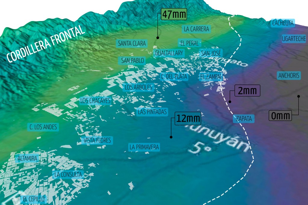 Pronóstico de precipitaciones 22/6-23/6 para el valle de Uco. La acumulación en milímetros en los faldeos cordilleranos es hasta 4 veces mayor que en los sectores alejados apenas 10km. Esto se debe a que cuando ingresa el frente frío cargado de aire húmedo, choca contra el alto macizo de la cordillera Frontal, desciende la temperatura hasta el punto de rocío y provoca la mencionada lluvia orográfica. Las zonas más altas y pegadas a la montaña del valle (San Pablo, El Peral, San José, La Carrera), son las más beneficiadas por este tipo de fenómeno, aunque no las únicas.