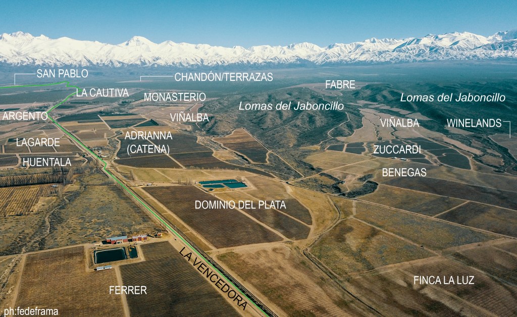La foto es una vista al oeste desde la zona media (1300msnm) y engloban diferencias altimétricas importantes, con regiones Winkler I, II y III en muy corta distancia. Se distinguen las fincas entre el abanico y las lomas del Jaboncillo, e inclusive se ve a lo lejos la finca más alta (+3ha) del valle de Uco. Ustedes amigos, ¿Qué vino o vinos son sus favoritos de Gualtallary?