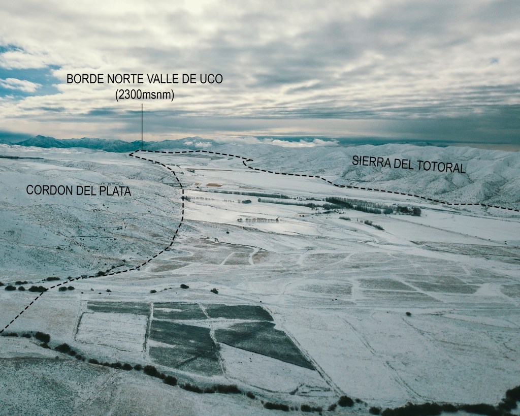 TODO TIENE UN FINAL, y el valle de Uco también. Pero se despide a lo grande, o mejor dicho, a lo alto. En esta muy inusual foto desde un drone se aprecia como el congelado valle se vuelve estrecho, se «acogota» entre la sierra del Totoral y el cordón del Plata y se eleva hasta los 2300msnm, antes de caer al valle de Potrerillos.