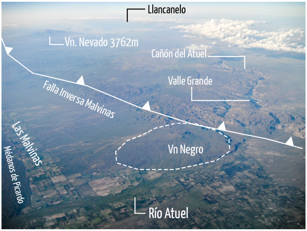 En la foto se aprecian algunos de los rasgos geológicos más distintivos de apenas la porción superior del valle, como la falla de las Malvinas levantando el Bloque de San Rafael y la posterior formación del Cañón del Atuel. Más adelante volveremos con más información (y mapas) de allí.