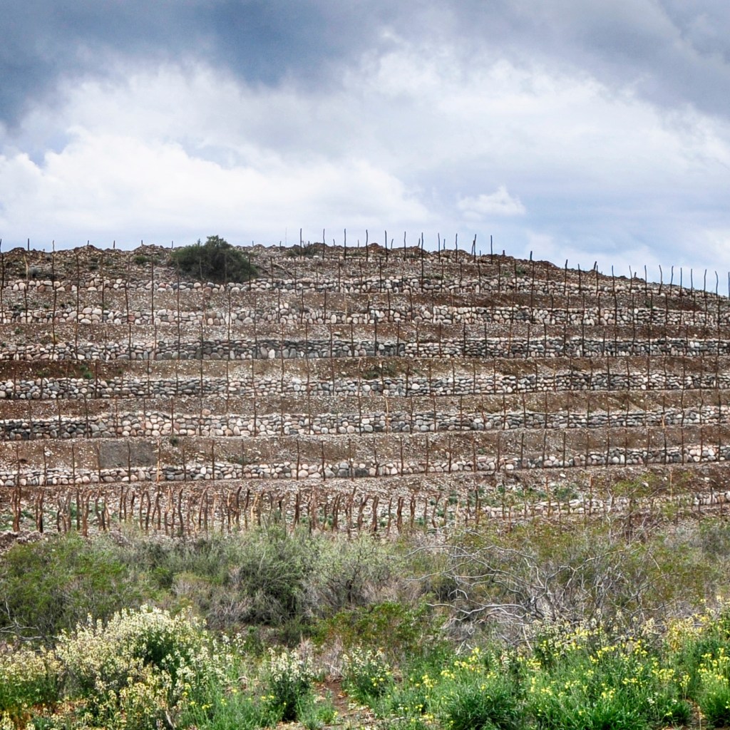 Las dos fotos que acompañan esta publicación son de viñedos entre las lomadas. La primera fue tomada desde la parte plantada sobre una de las lomas y la segunda es una novel terraza con orientación sur. Dos ejemplos de los múltiples escenarios que permiten este tipo de lugares de los que no estamos tan acostumbrados en Mendoza.
