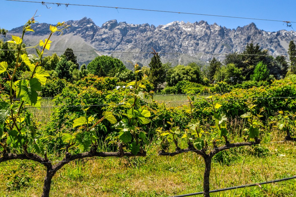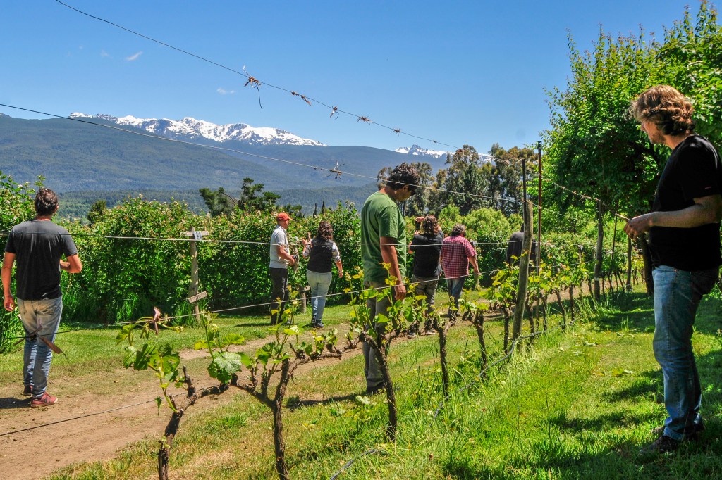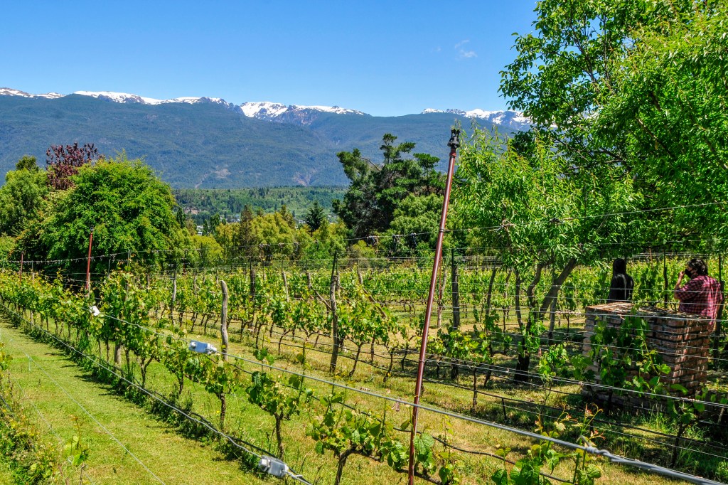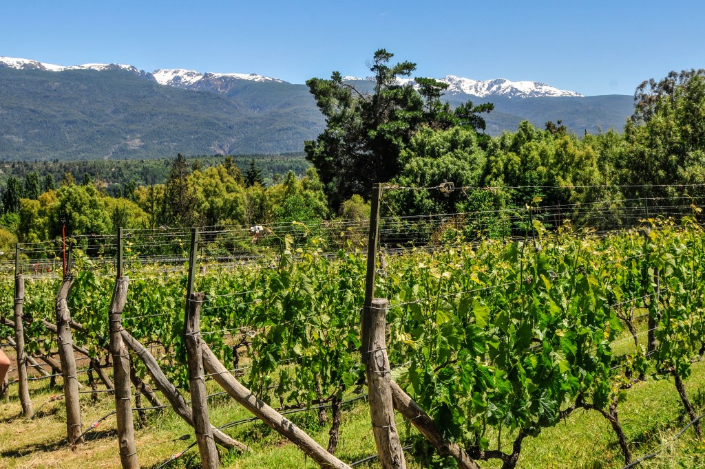 En la foto aparece uno de los viñedos más bonito que nos tocó conocer, el del proyecto @bodegadebernardi. Apoyado en las laderas del cerro Piltriquitrón, se tiene una vista general del valle y de los picos nevados. Un lugar de ensueños.