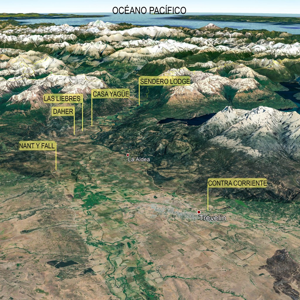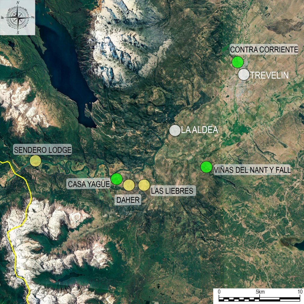 El mapa que abre este posteo muestra la ubicación de Trevelin y La Aldea, los tres proyectos que actualmente vinifican (en verde), y los otros tres proyectos que comenzarán a hacerlo en breve (en amarillo). Se aprecia un cambio de tonalidades desde Trevelin hasta el límite con Chile, donde paulatinamente aumenta la humedad y las precipitaciones.