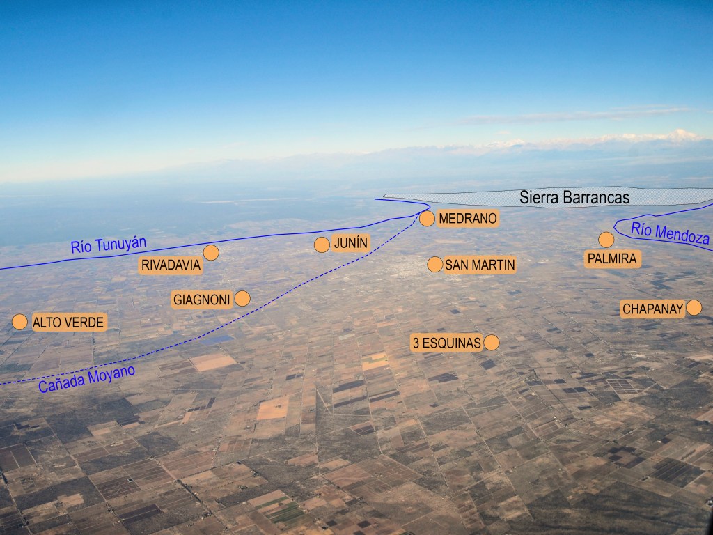 Geográficamente está compuesto por los departamentos de Santa Rosa (fuera de la fotografía), Rivadavia, Junín y San Martín). Corresponde a una gran planicie aluvial generada por los ríos Mendoza y Tunuyán, cuando hasta hace unos cientos de años se unían conformando el gran río del Zonda. En la actualidad el Mendoza cambia bruscamente de rumbo hacia el norte (el «codo del Mendoza» se aprecia notablemente), e inclusive el Tunuyán tenía dos brazos hasta la llegada de los inmigrantes. El brazo norte es la Cañada de Moyano y pasaba muy cerca del centro de San Martín.