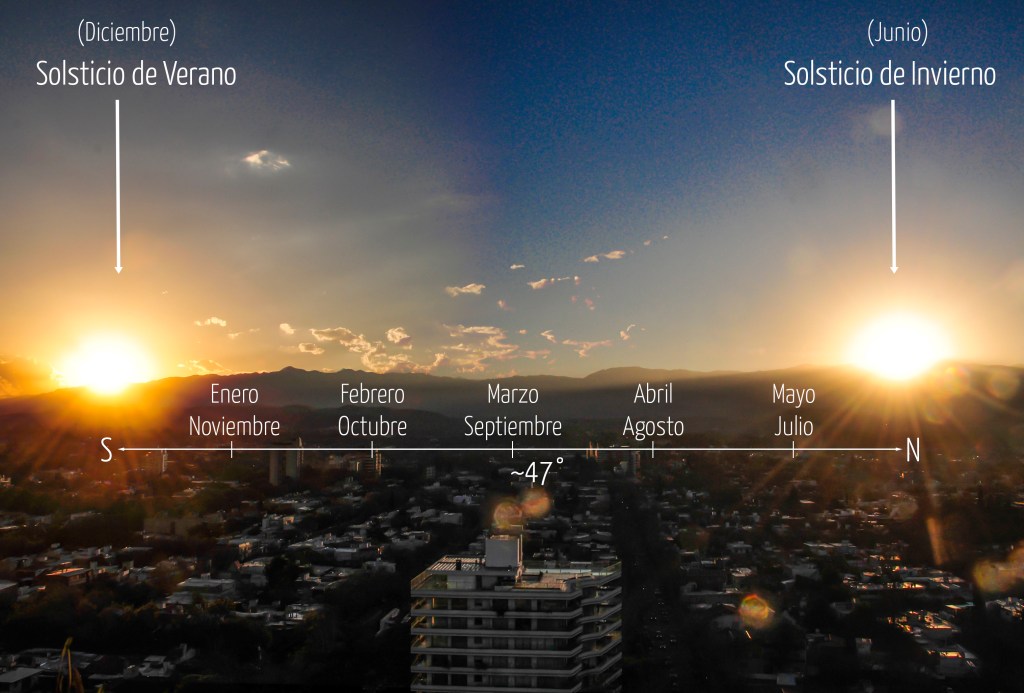 La imagen que acompaña la información es una composición de dos atardeceres tomadas exactamente en el mismo lugar (ciudad de Mendoza) los días 21 de junio y 21 de diciembre. Se aprecia el desplazamiento del sol desde el norte en invierno (derecha) hacia el sur en verano (izquierda) durante el atardecer. Hay 183 atardeceres que se dan entre esos dos puntos, desplazándose de izquierda a derecha y viceversa en infinitos ciclos de 6 meses a lo largo de toda nuestra existencia.
