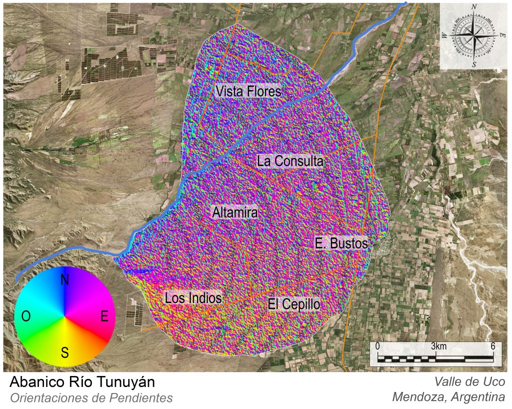 El área del abanico está delimitada con un mapa de orientaciones de las pendientes. Los eventos tectónicos y climáticos moldearon los diferentes sectores del abanico, dando lugares de suelos muy amplios, como arenosos francos (Los Indios), franco arenosos (Vista Flores), francos (La Consulta / Eugenio Bustos), pedregosos modernos (riveras de La Consulta y Vista Flores), arenosos calcáreos (Altamira / El Cepillo).