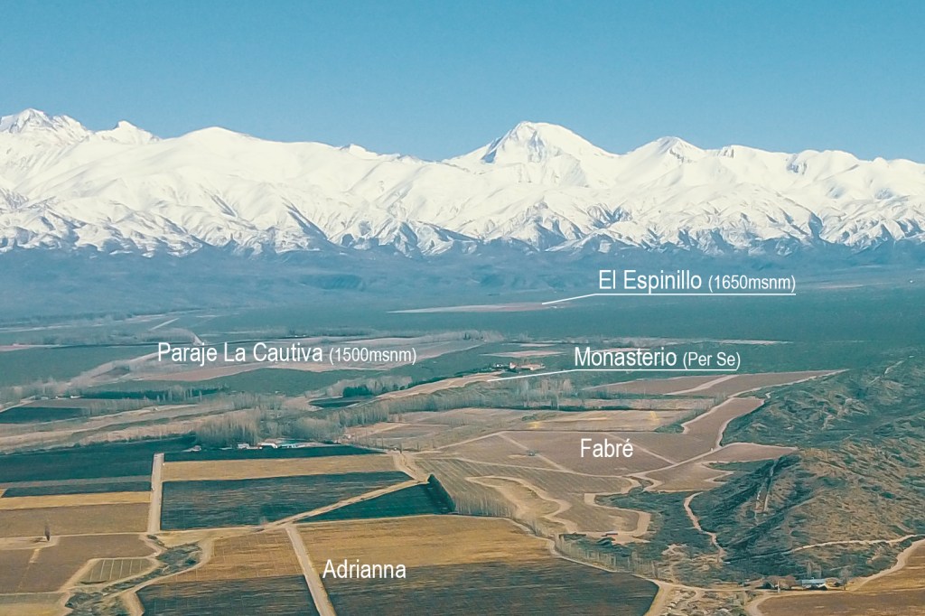 ¿Qué vemos? Lo primero son los viñedos que se aprietan contra una sierra que aparece a la derecha. Estamos en la porción más alta de Gualtallary, donde los viñedos aparecieron recién hace dos décadas o menos. Los viñedos del monasterio se distinguen fácilmente, están elevados respecto al resto, plantados sobre la última costilla sur de las sierras. Más arriba está el paraje de La Cautiva, región de rápido desarrollo en estos últimos años y con muchos proyectos por ver la luz super interesantes. Por último y casi descolgado, está la viña más alta del valle de Uco de más de 5 hectáreas, en una zona ya límite a causa del clima.