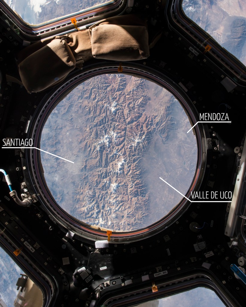 Vista de la región central de los Andes, con los principales núcleos urbanos a ambos lados. Este fotón pertenece a la @nasa, fue tomada desde el sector de «La Cúpula» de la ISS y sólo le adicionamos los tres nombres. El #valledeuco aparece en primerísimo plano y entre otras cosas, se aprecia el coloso de América (Aconcagua) como el pico nevado más al norte. Este tipo de fotografías además de ser hermosas, son explícitas mostrando al ambiente que habitamos. Explican la vitivinicultura de montaña, donde tanto los suelos donde se plantan las viñas como el agua que las riega provienen de los Andes, espina vertebral que provee vida a ambos lados del continente. Será hasta la próxima.