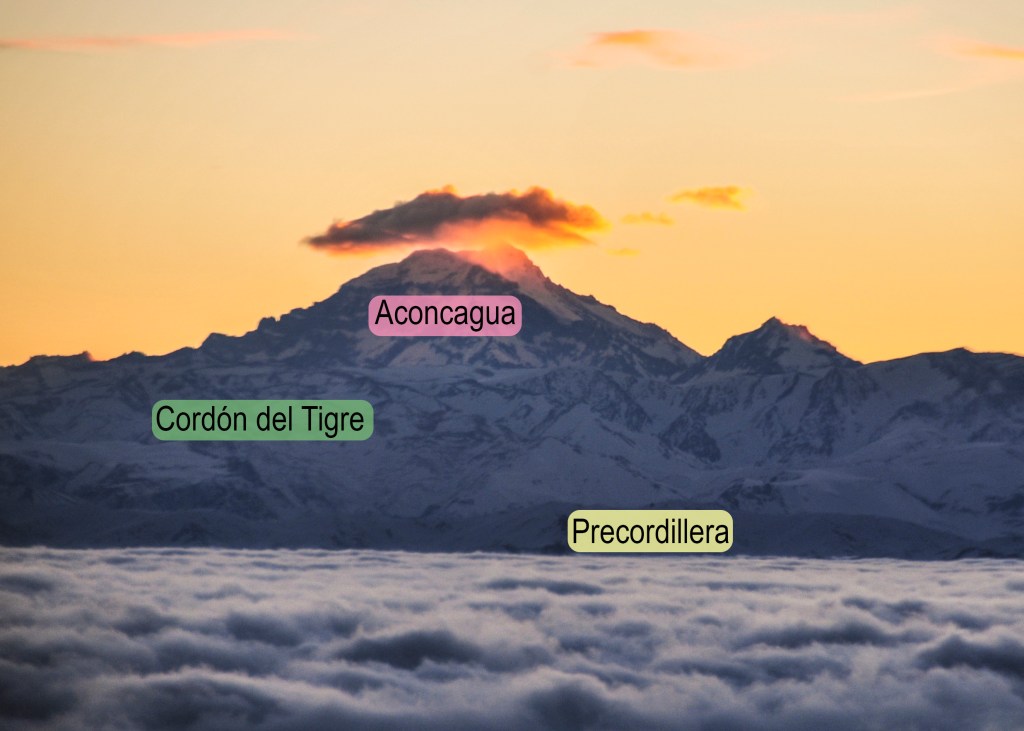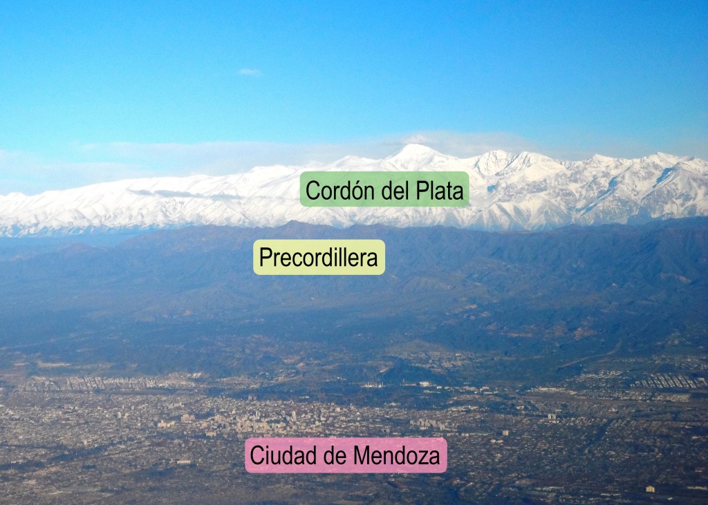 El telón de fondo de los viñedos, que se ve tan icónico, fotogénico y nevado es el cordón del Plata. Su altura es inmensa, llegando casi hasta los 6000 metros (foto 2), lo que lo hace visibles desde los puntos altos de varias provincias argentinas.
