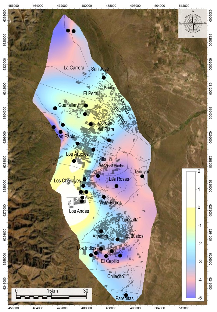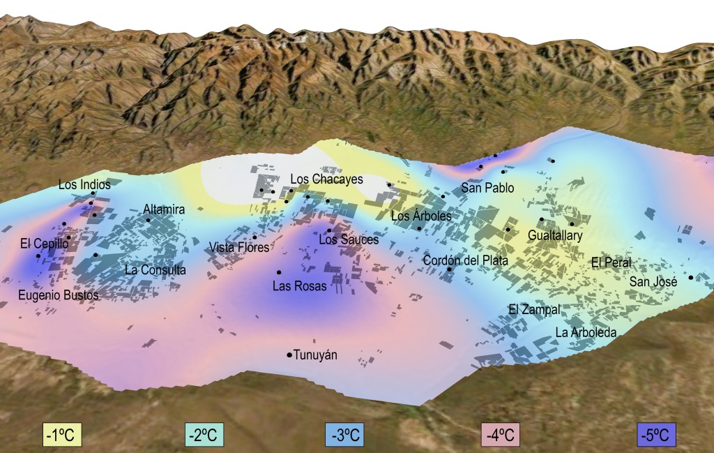 El mapa que preparamos es una vista 3D hacia el oeste, con la cordillera de fondo. En colores está la distribución de las temperaturas mínimas y en gris, la superficie de viñedos. Esto es super útil porque pueden ver dónde están las viñas y cuánta temperatura hizo. Los puntos negros son las estaciones que aportaron datos para la generación del mapa. Por último, se adicionaron los nombres de los principales lugares a modo de referencia.