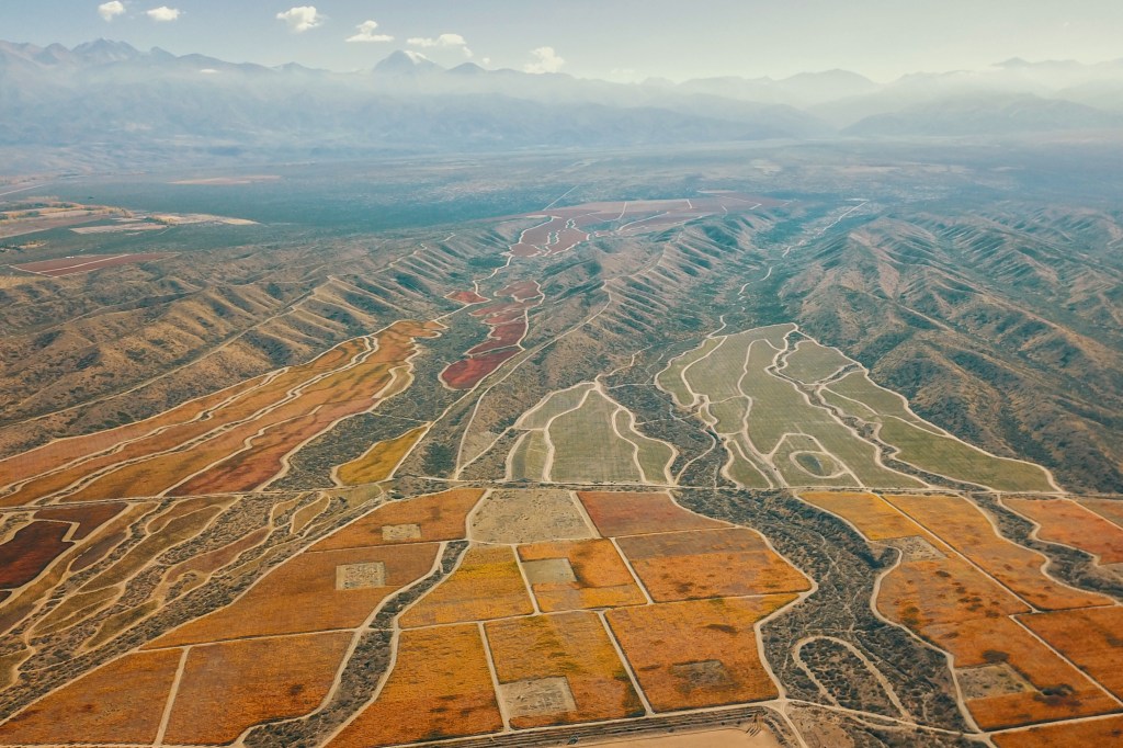 Esta foto es particularmente hermosa, y no sólo estamos hablando del paisaje otoñado, de las lomas del Jaboncillo, la cordillera de fondo con el inmenso volcán Tupungato, sino de algo más. Lo nosotros vemos es un cambio de paradigma en como se cultiva en un lugar. ¿Lo notan?