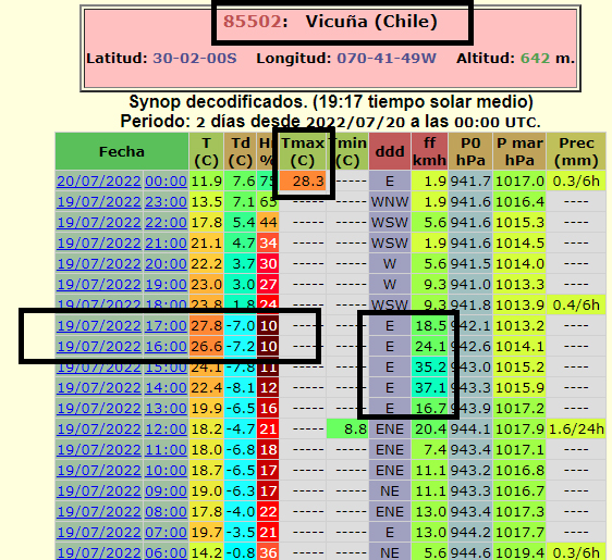 En el hermoso valle pisquero y vitivinícola 🍇 del Elqui (foto 1), se llama como en España 🇪🇸, terral. Más al sur se lo conoce como puelche, puihua o raco. La segunda imagen es una tabla de la estación Vicuña, donde se aprecia la caída de la humedad junto a un aumento de la temperatura y de la velocidad del viento desde la dirección este.
