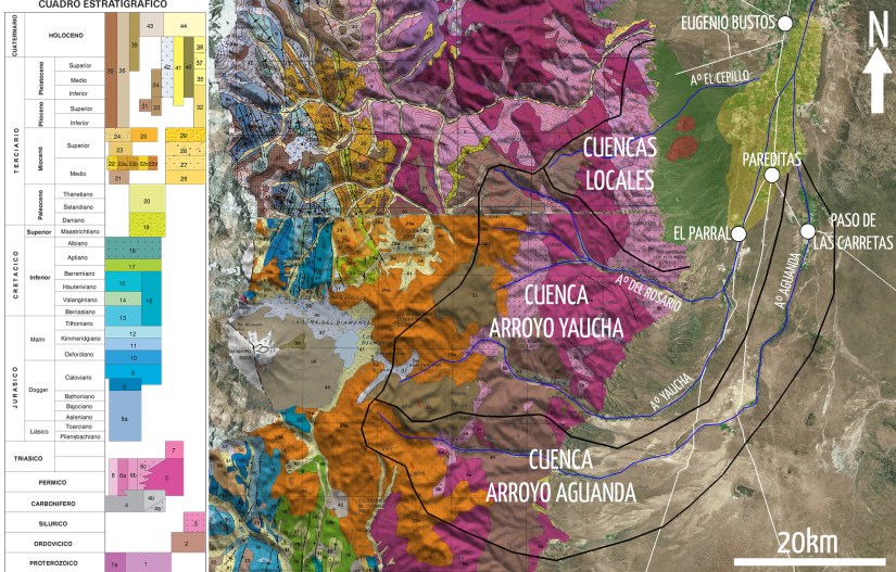 La porción más sur del valle de Uco tiene una característica que la hace distintiva del resto. Los ríos no vienen desde el piedemonte del oeste sino que ingresan al valle desde el sur, hacia la parte más baja. Esta falta de agua en las zona piedemontana es la que impidió su desarrollo vitivinícola, como sí sucedió en el resto del valle de Uco (ejemplo: Los Chacayes, Gualtallary, Altamira). En el siguiente mapa se muestra la extensión de las cuencas de captación junto a la división entre sector de piedemonte (en verde) y fondo de valle o planicie loéssica (en amarillo). Las cuencas locales del piedemonte son extremadamente chicas, lo que no desarrollan arroyos permanentes. En cambio los ríos Yaucha y Aguanda, poseen cuencas más grandes e ingresan al valle desde el sur. Si quieren saber más info de esta sola imagen, ir al posteo correspondiente.